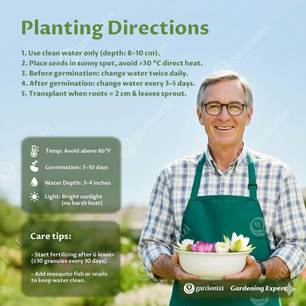 As sementes de lótus geralmente brotam em 5 a 10 dias, apresentando uma pequena raiz ou uma folhinha. Algumas podem demorar um pouco mais, então seja paciente!